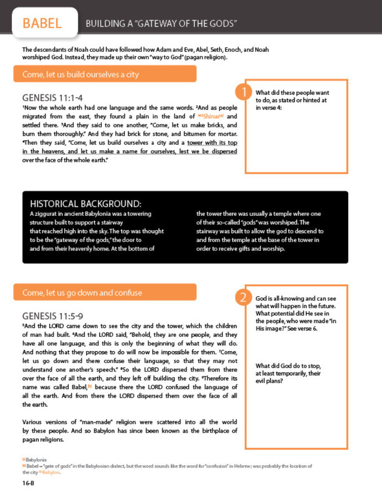 Book 2 covers 9 chronological events on early Bible history covering the three Bible Eras "Flood", "Babel", and "Patriarchs."