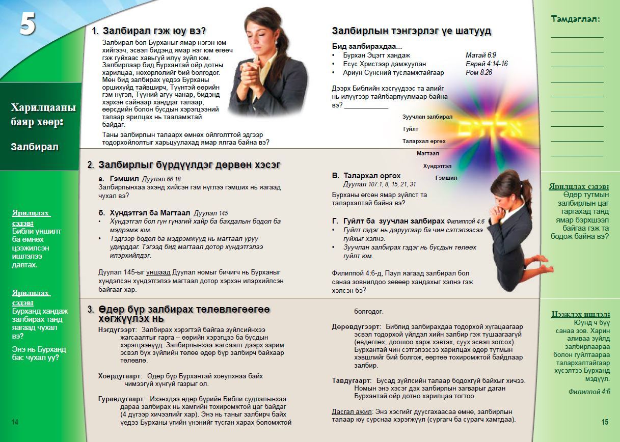 Энэхүү 200 хуудастай ажлын ном нь 50 үйл явдлын хичээл бүрд 4 хуудас зориулсан бөгөөд нийт 200 хуудастай. 50 Библийн үйл явдлын хичээл бүрд: гол анхаарах хуудас, хичээлийн хоёр хуудас болон үйл явдлын дүгнэлт орсон байгаа. Ажлын номонд 15 хэсэг бүрийг хавчуургаар хуваасан байгаа. Хуудаснууд нь гоёмсог өнгөөр дүрслэгдсэн. Мөн хичээлүүдэд зориулагдсан (тусгайлан хийгдсэн) Библийн газрын зурагтай.