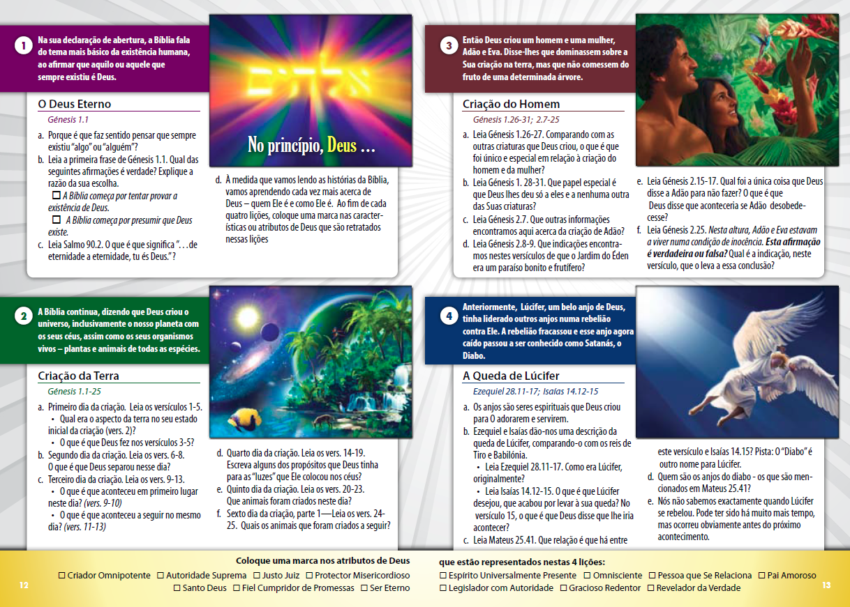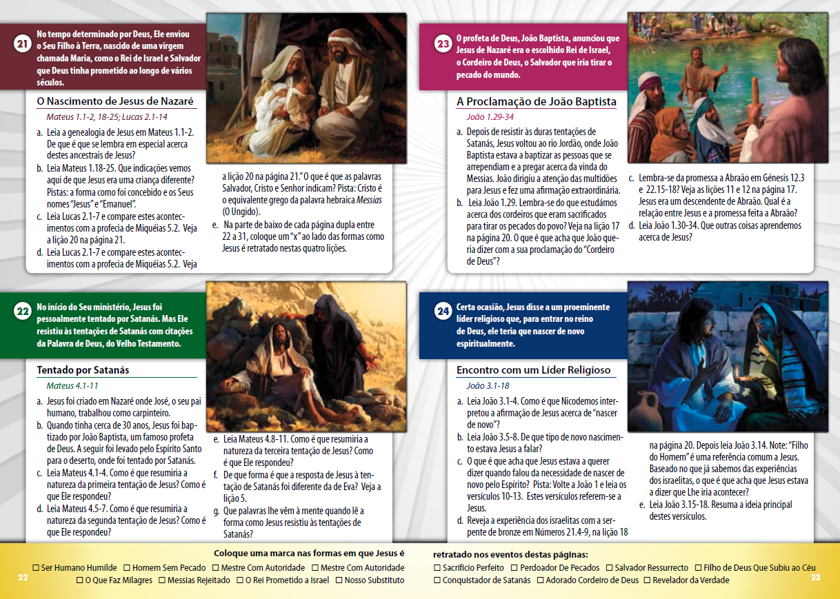 O livro de 200 páginas inclui quatro páginas para cada uma das 50 lições de eventos, um total de 200 páginas. Cada uma das 50 lições de eventos bíblicos inclui: uma página de foco, duas páginas que desenvolvem a lição, e um resumo narrativo da lição-evento. Os livros incluem um separador para cada uma das 15 secções. As páginas são bem apresentadas e coloridamente ilustradas. Está incluído um conjunto de mapas bíblicos feitos especificamente para o currículo.