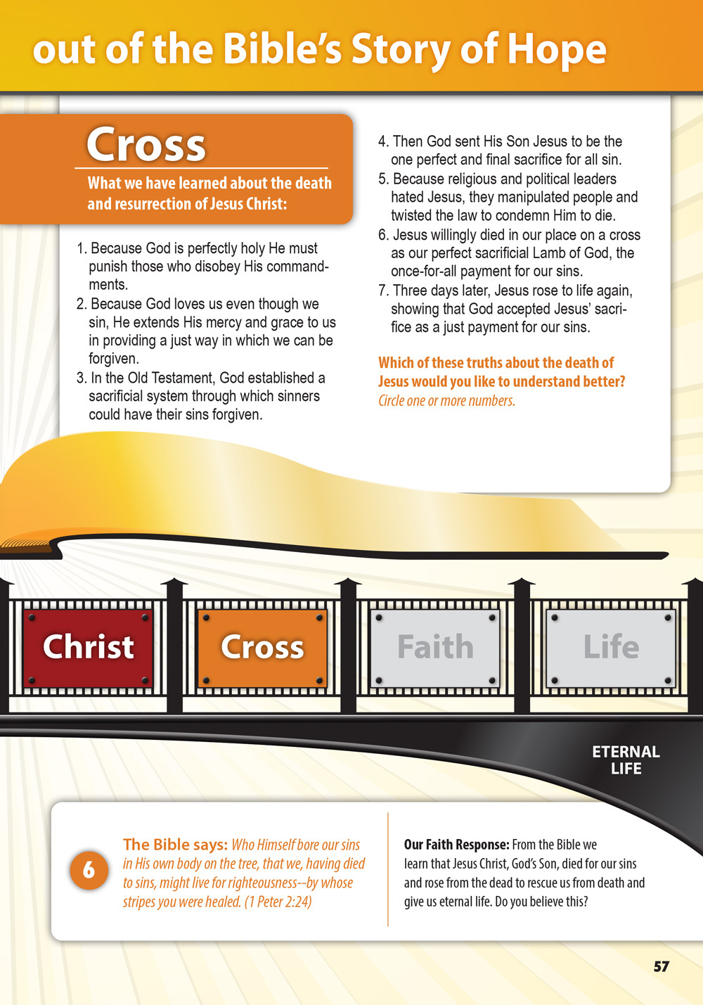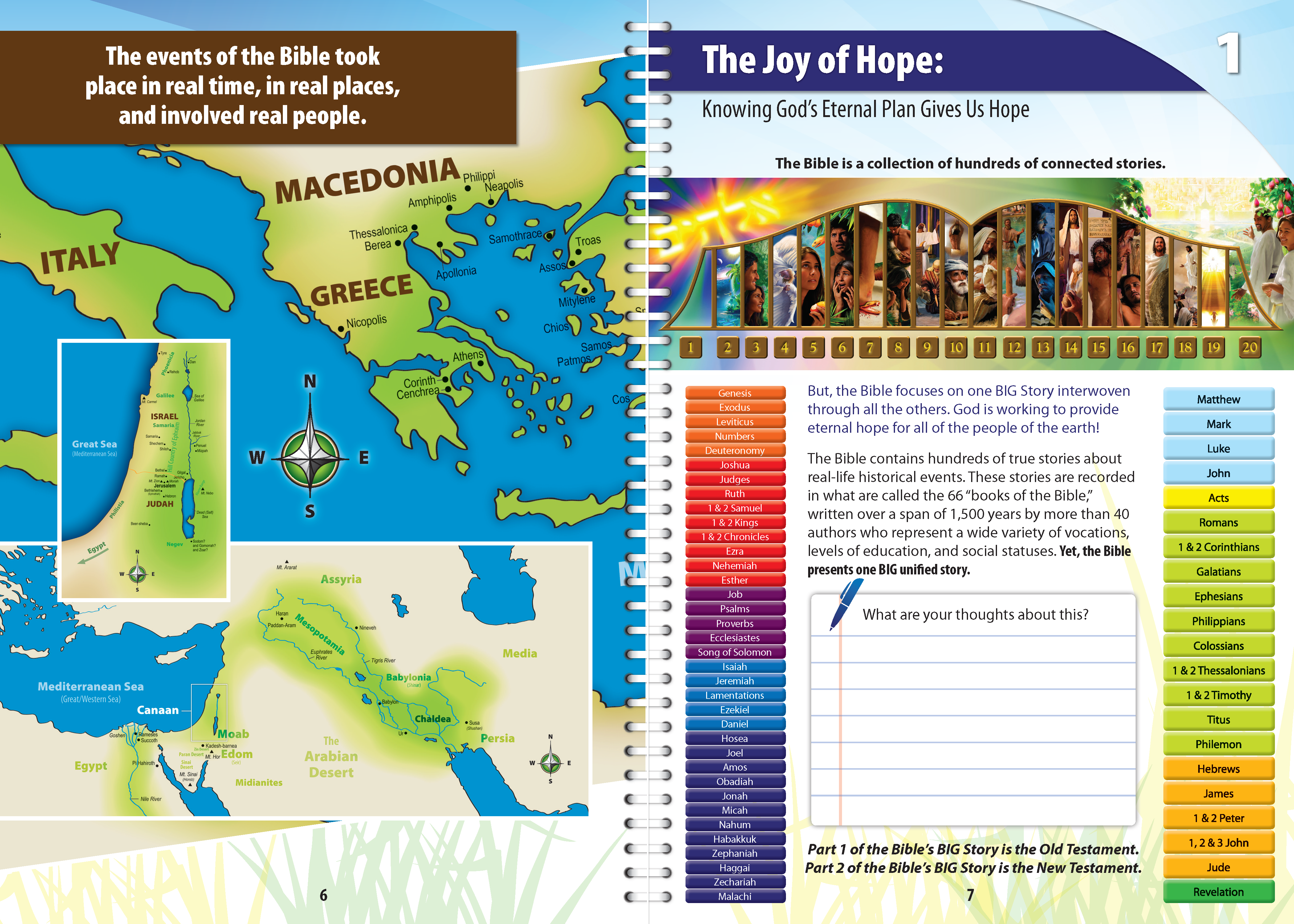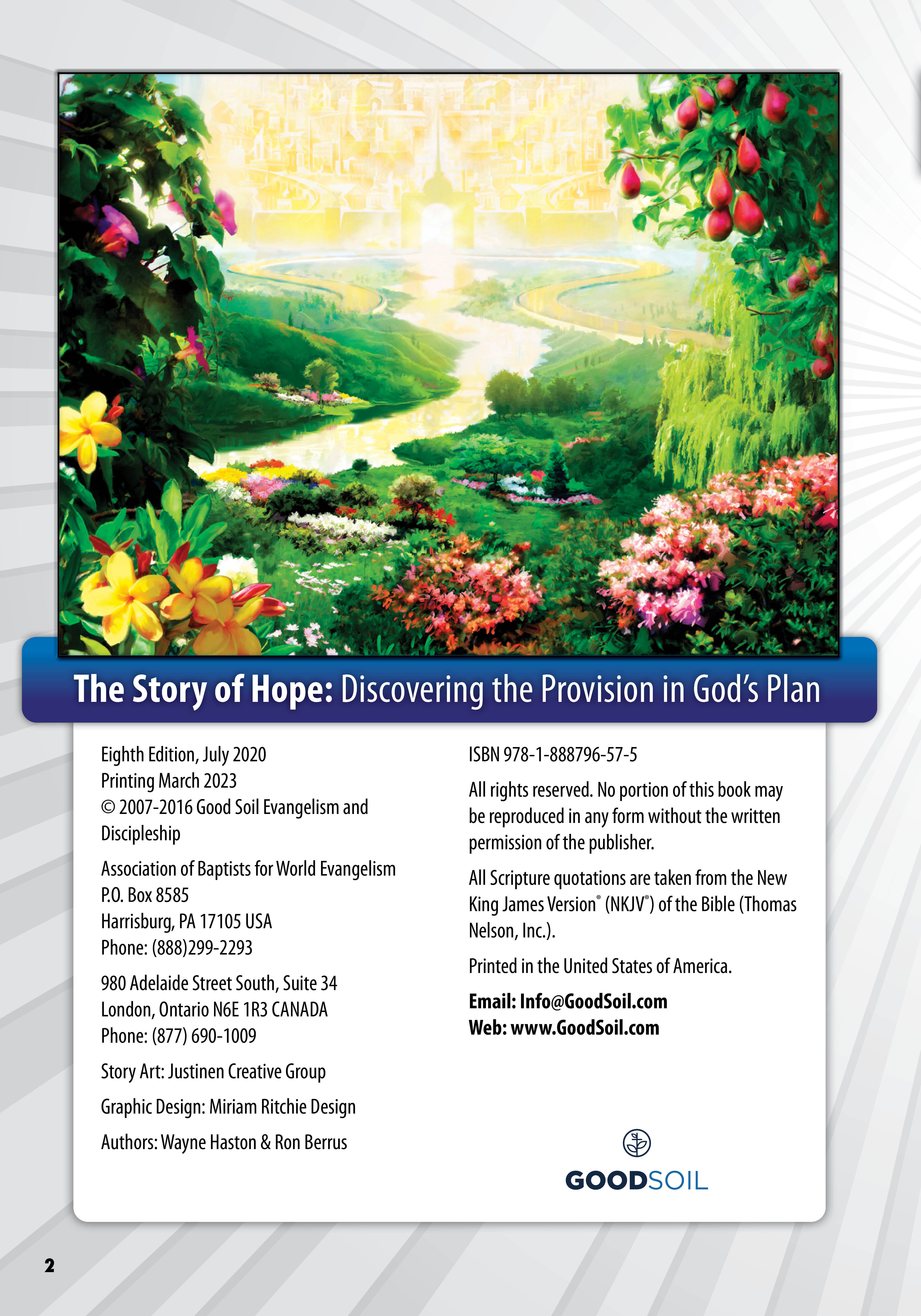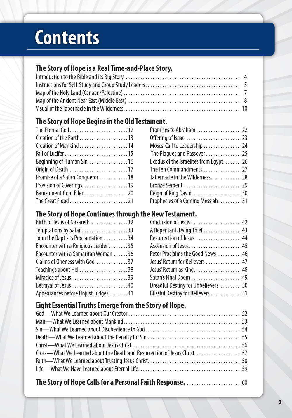 The Story of Hope uses 40 key Bible events to summarize this story, 20 from the Old Testament and 20 from the New Testament. The book is formatted in such a way that the gospel message can be shared as a story in a few minutes, or taught in lesson form over several hours.