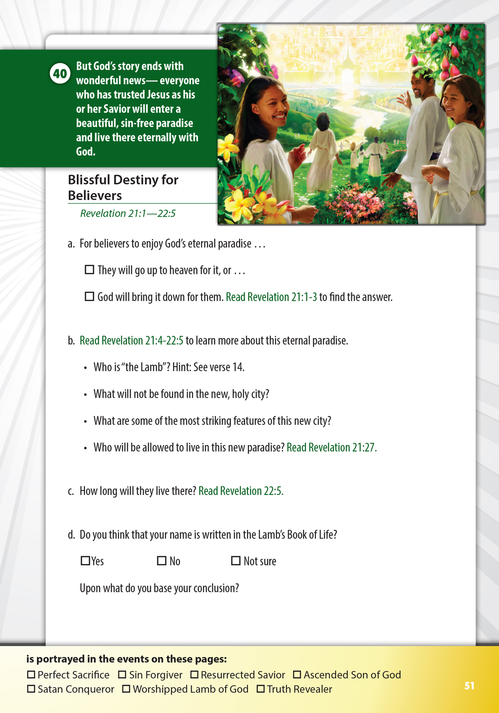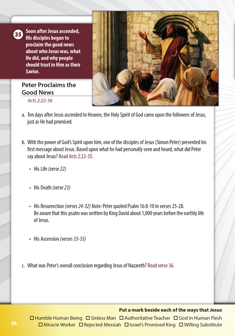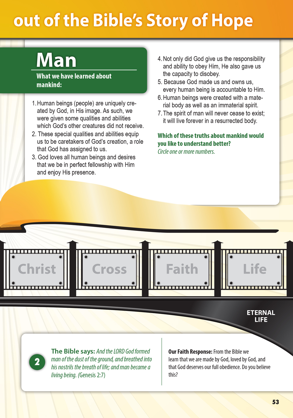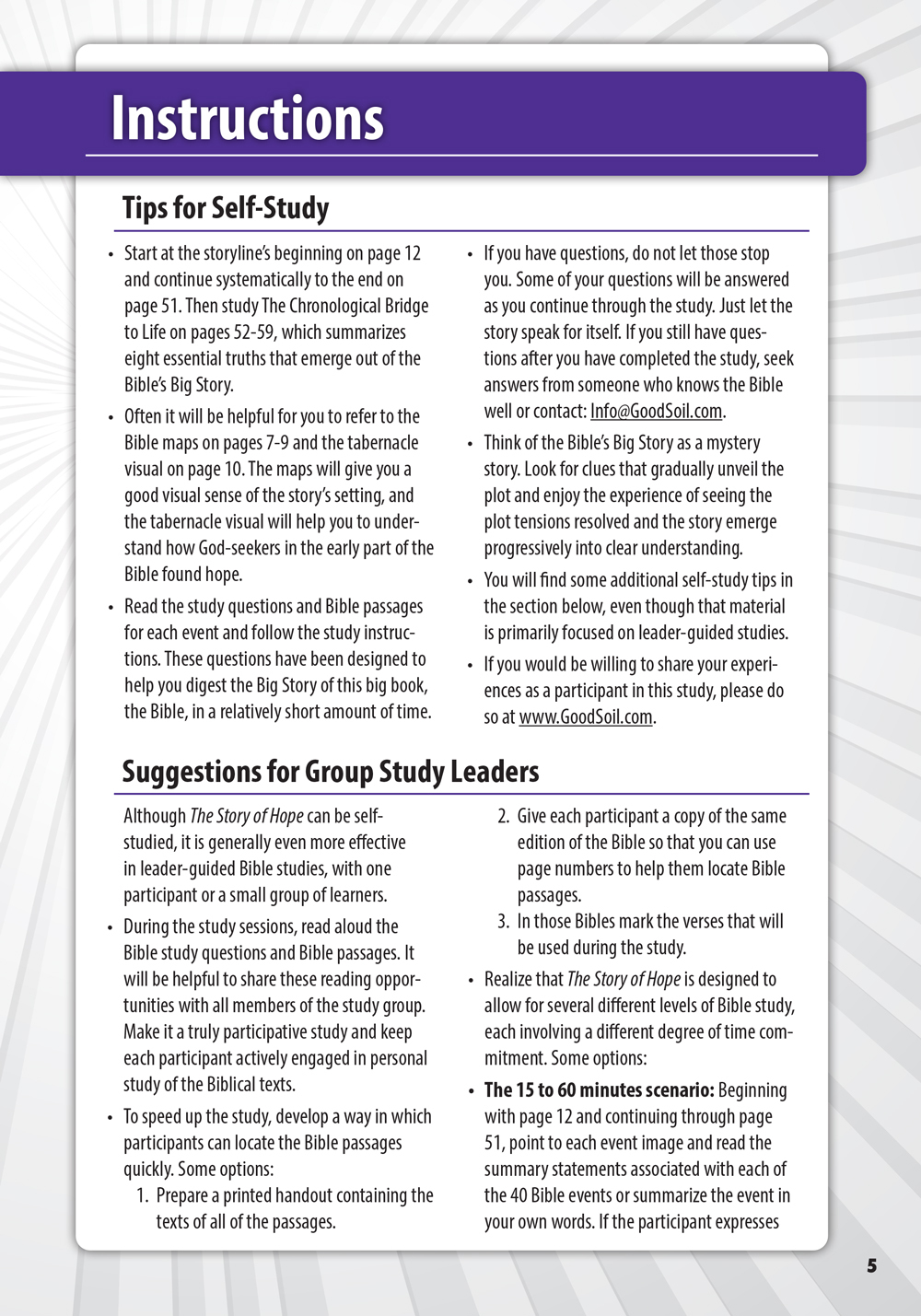 The Story of Hope uses 40 key Bible events to summarize this story, 20 from the Old Testament and 20 from the New Testament. The book is formatted in such a way that the gospel message can be shared as a story in a few minutes, or taught in lesson form over several hours.