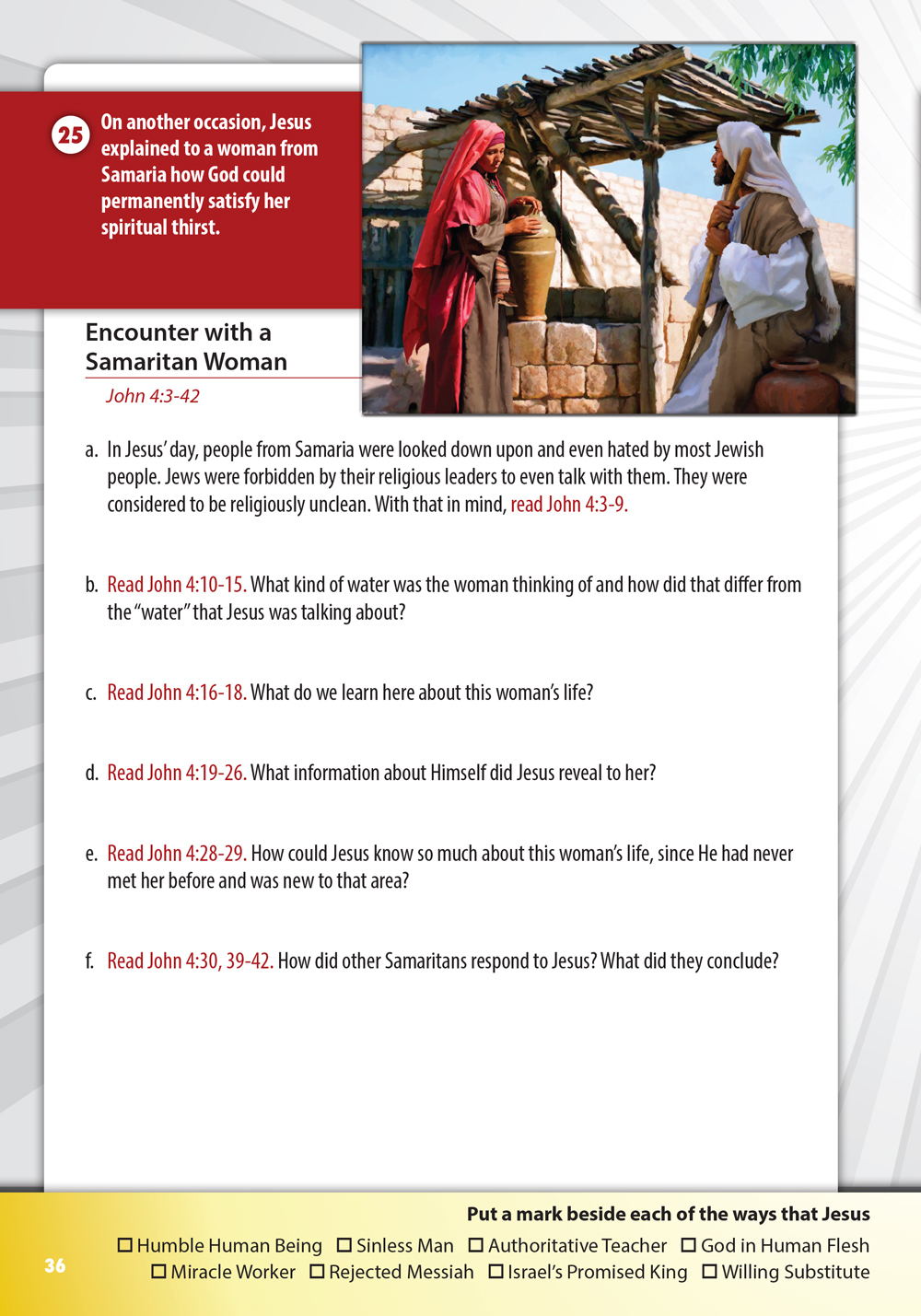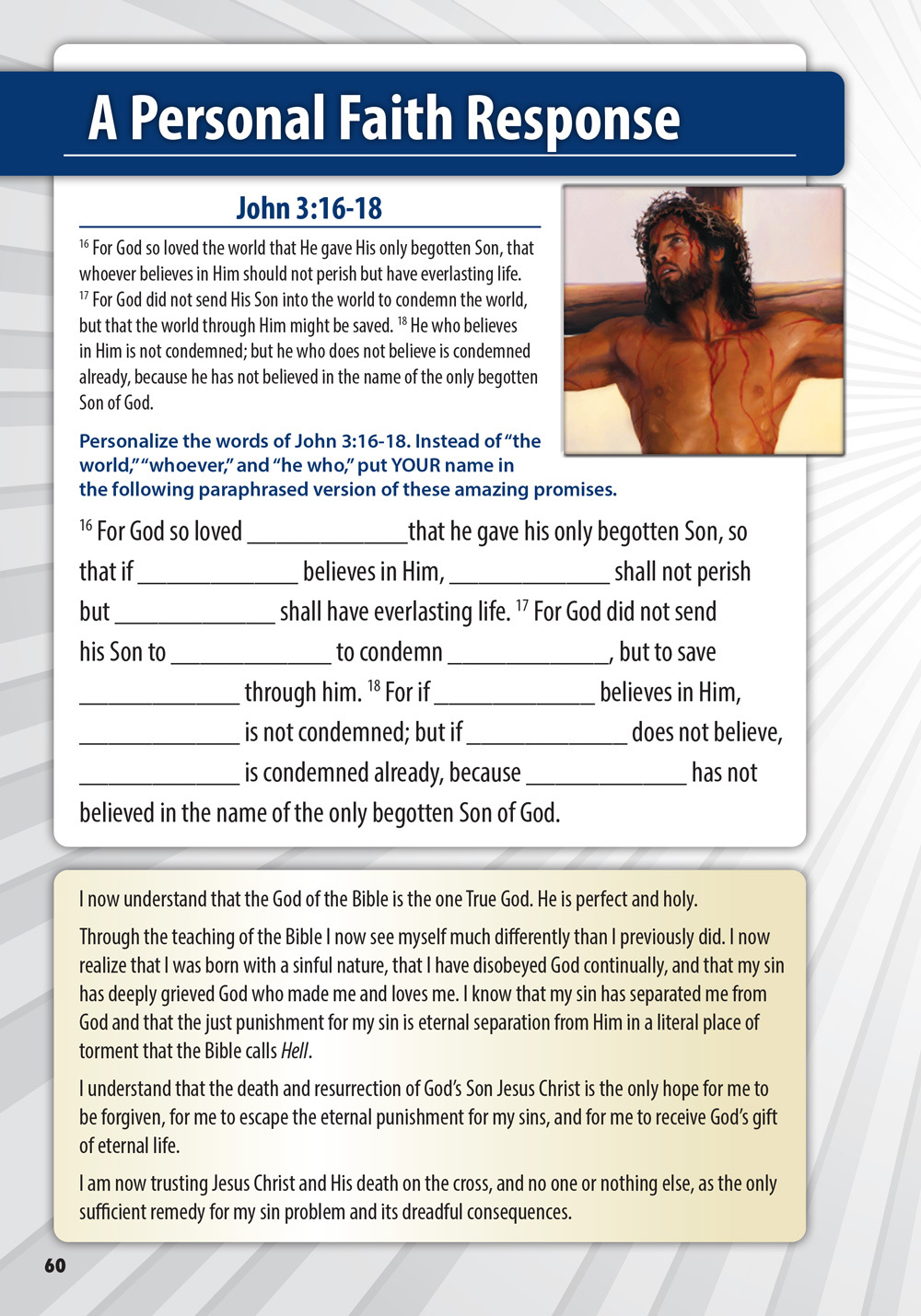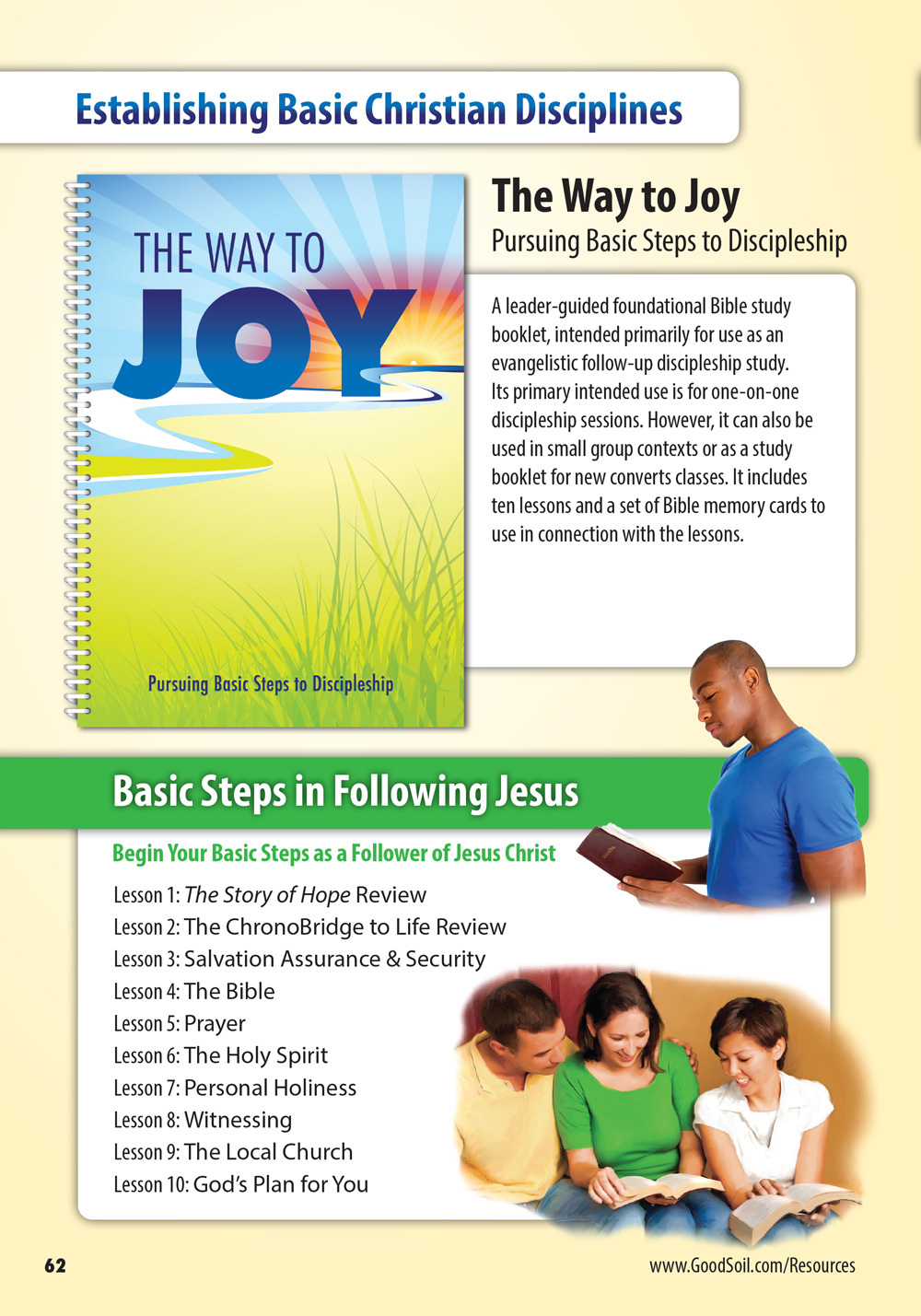 The Way to Joy is a basic follow-up study designed to lead a new believer through ten important lessons, covering an overview of God’s redemptive plan, the ChronoBridge to Life, security and assurance, the Bible, prayer, the Holy Spirit, personal holiness, witnessing, the local church, and God’s plan for the believer’s life. Each booklet includes a set of Bible memory verse cards and a chapter-per-day Bible reading plan.