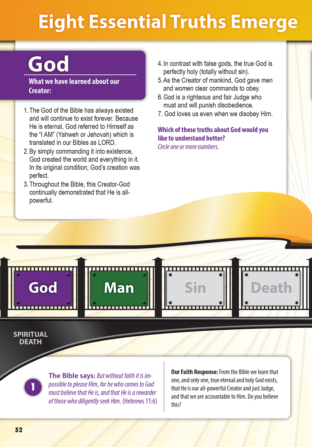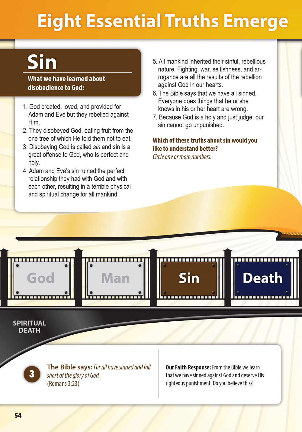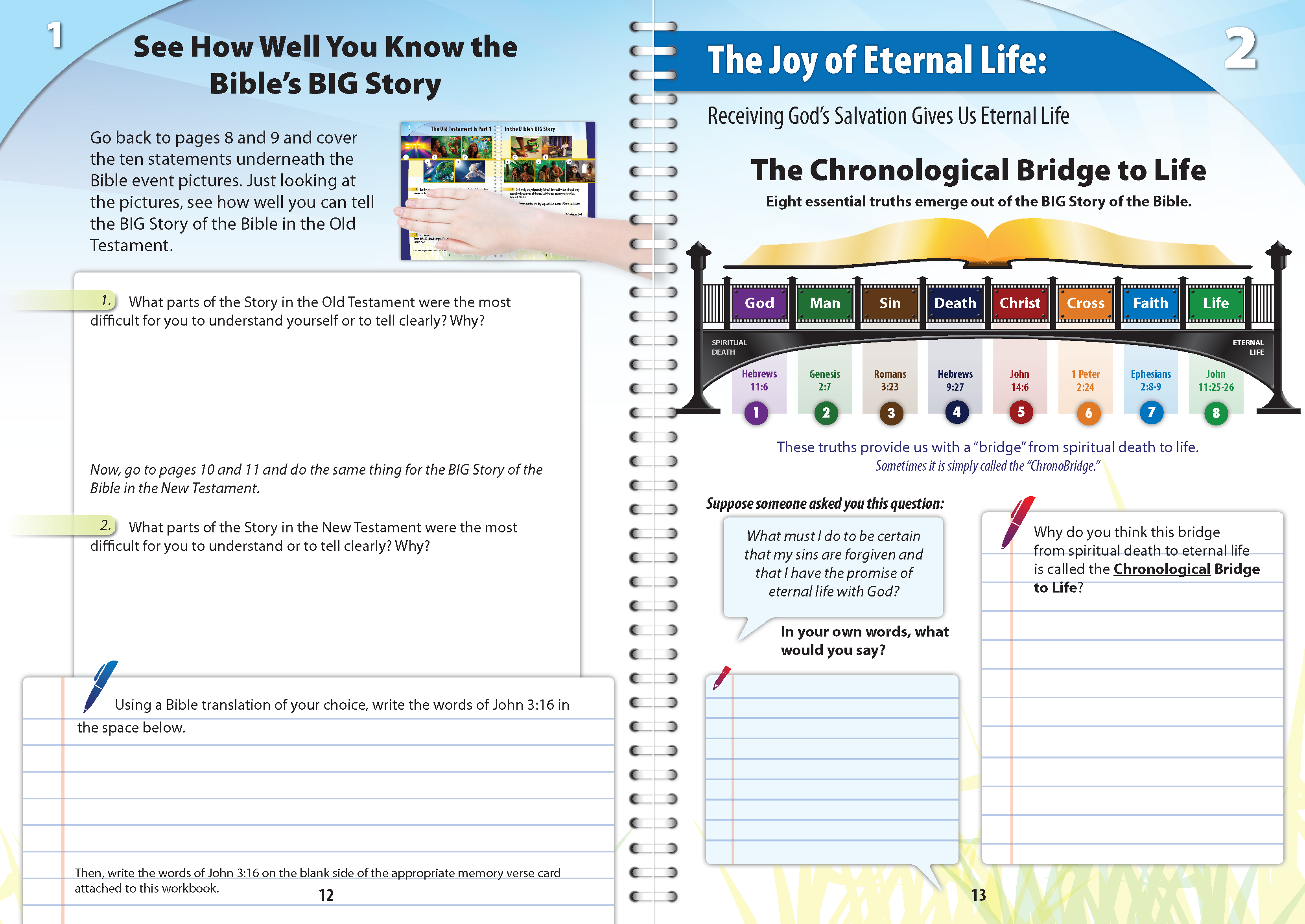 The Chronological Bridge to Life reviews eight important truths that emerge out of the Bible’s story of hope—God, man, sin, death, Christ, cross, faith, and life. We call this the ChronoBridge because the eight concepts are presented in the chronological order in which they emerge out of the story. The ChronoBridge allows the gospel presenter to (1) clarify the gospel, (2) personalize the gospel, and (3) encourage-persuade an unbeliever to embrace the gospel. Each bridge concept is reinforced with a key Biblical text and a personal challenge to respond by faith to the gospel concept.
