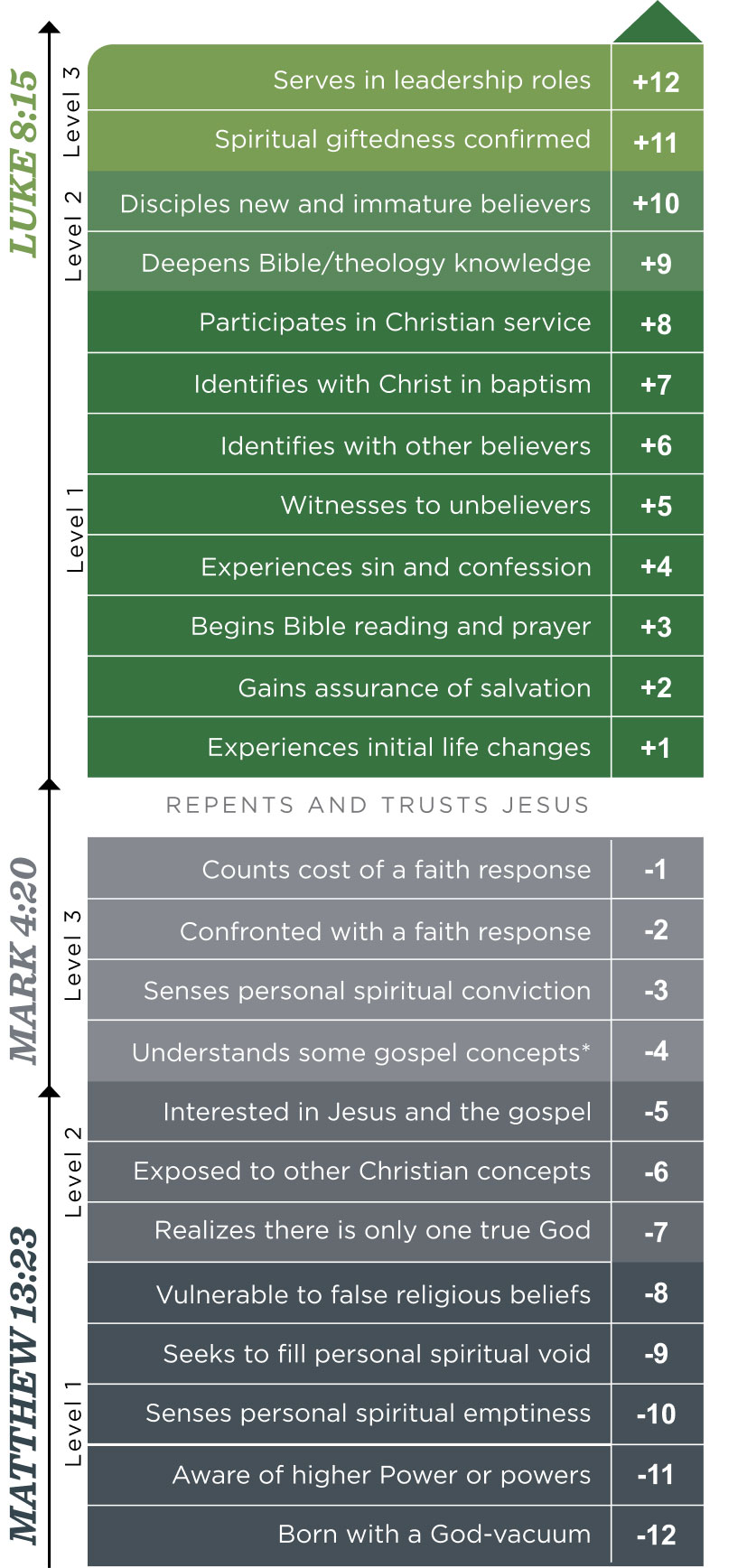 The scale is particularly helpful in determining how much Bible content and Biblical context for that content we need to share with an unbeliever in order for him/her to make a “good soil” decision to genuinely embrace Jesus Christ as Savior.