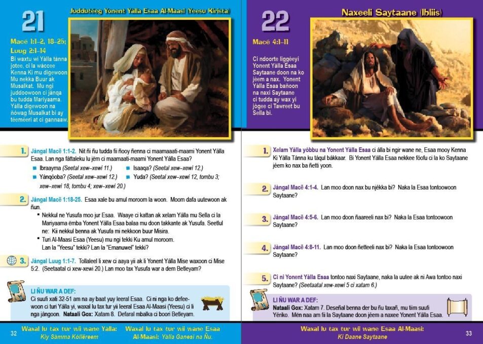 The Message of Hope Kids: Discovering the Provision in God's Plan - Wolof Edition, with plastic coil binding, is a full color adaptation of the adult-level book, The Message of Hope. It is visually designed and language level adapted for kids, ages 8-12. The Message of Hope Kids contains the same core content as the adult-level version: 40 key event-lessons for teaching and learning the Bible's big redemptive story and the Chronological Bridge to Life (ChronoBridge). A full page is dedicated to each of the 40 Bible event-lessons, allowing space for kids to write down the answers to the questions. This 64 page workbook also includes fun Bible map learning activities.