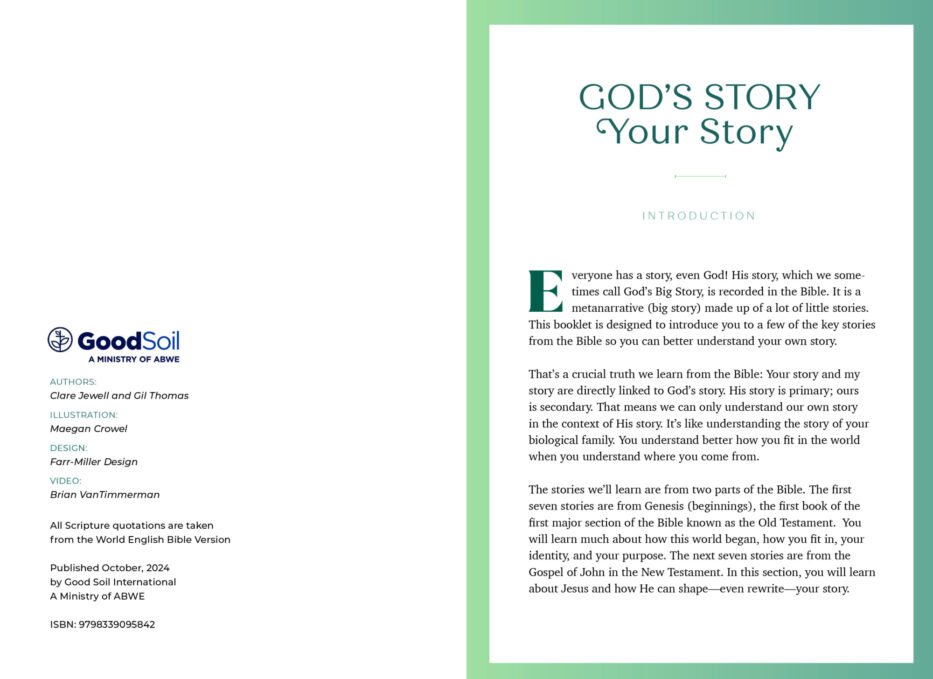 This study, developed by Good Soil & EveryEthne (ABWE Global Family of Ministries) is designed for those who wonder how their story fits into God’s big story and how to connect the two. We will start at the beginning and end with Jesus. He is the author of life, and He created us to fit into His eternal plan.
