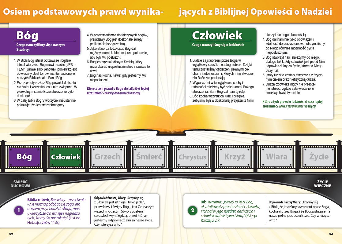 Za pomocą Historii Nadziei można przedstawić biblijną historię odkupienia - w zależności od dostępnego czasu – od piętnastu minut do dwudziestu lub więcej godzin. Historia Nadziei jest przeznaczona do ewangelijnej nauki Biblii, rozmów w cztery oczy czy do użytku w małych grupach, ale jest także pomocna w nauczaniu wiernych Bożego planu odkupienia. Zawiera lekcje dotyczące 40 wydarzeń biblijnych (20 ze Starego Testamentu, 20 z Nowego Testamentu), jak również mapy biblijne.